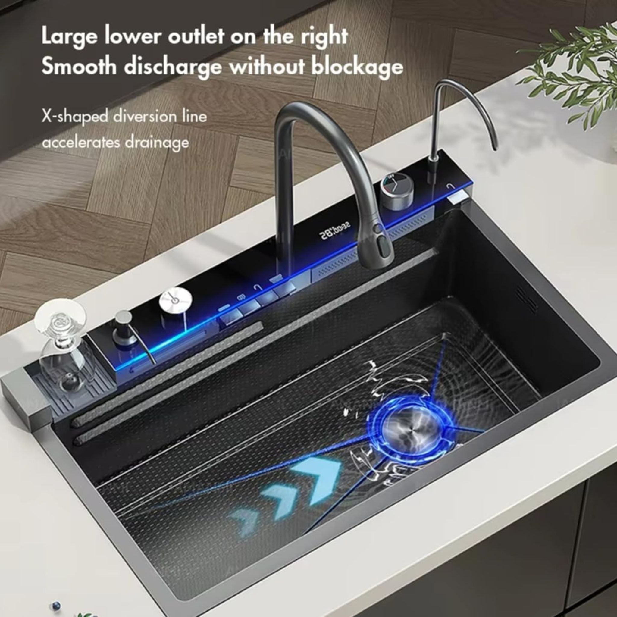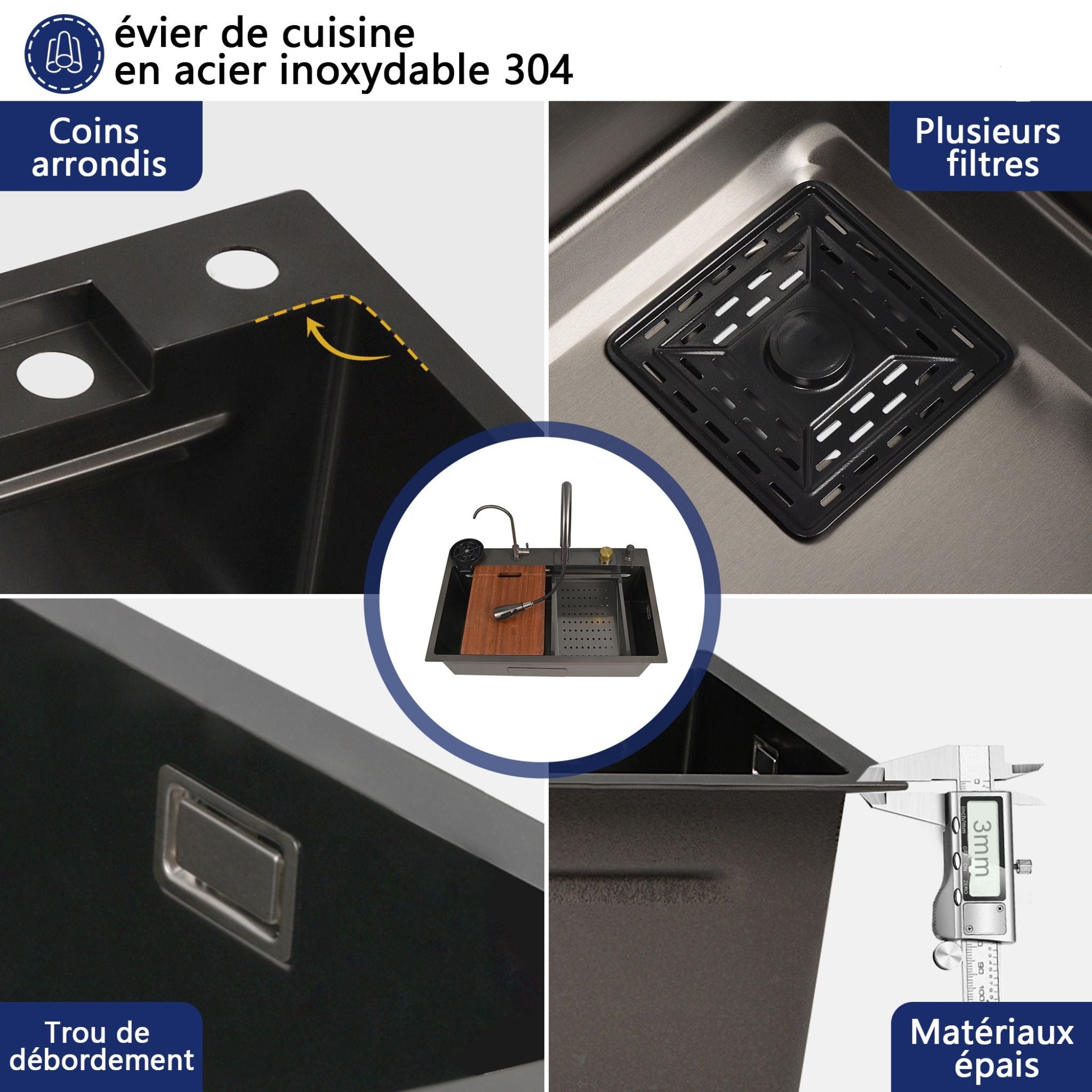 Évier de Cuisine Multifonction Inox Noir avec Cascade et Affichage Numérique