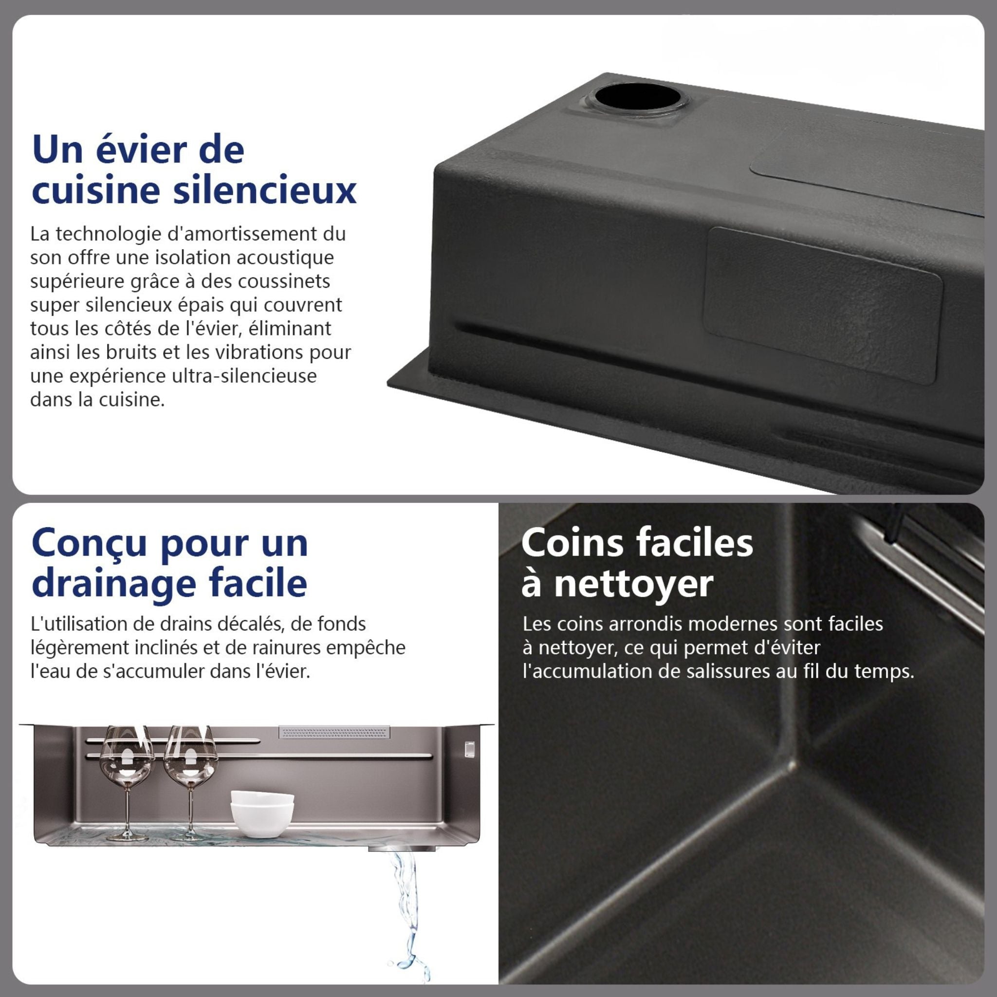 Révolutionnez votre espace de préparation avec cet évier de cuisine "workstation" qui combine design intelligent, durabilité et polyvalence. Conçu en acier inoxydable avec une finition nano noire brossée, il offre une résistance supérieure aux chocs, aux rayures et aux taches, tout en étant incroyablement facile à entretenir.