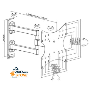 Profitez d'une flexibilité de mouvement exceptionnelle. Le bras articulé permet une rotation latérale jusqu'à 180 degrés (+/-90°), idéale pour orienter l'écran vers différentes zones de la pièce. Vous pouvez également l'incliner de 15° vers le haut ou le bas pour éliminer les reflets. Rétractez-le à seulement 50 mm du mur pour un look discret, ou étendez-le jusqu'à 400 mm pour trouver l'angle de vue parfait. L'installation est simple et rapide grâce au kit de matériel complet inclus.
